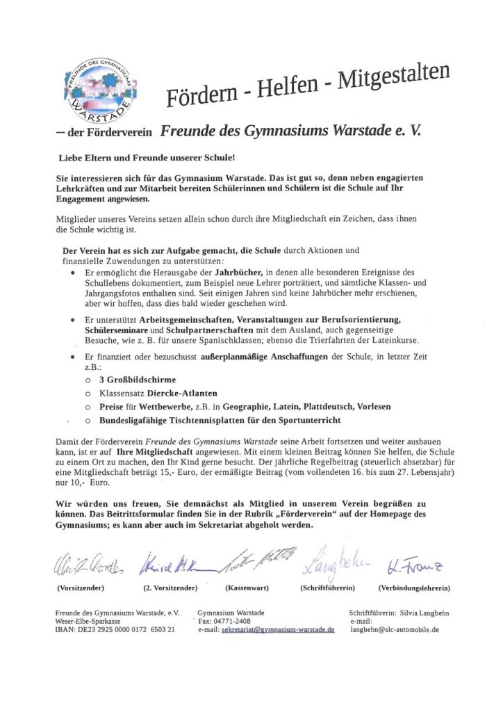 Eintrittserklärung in den Verein der Freunde des Gymnasiums Warstade
