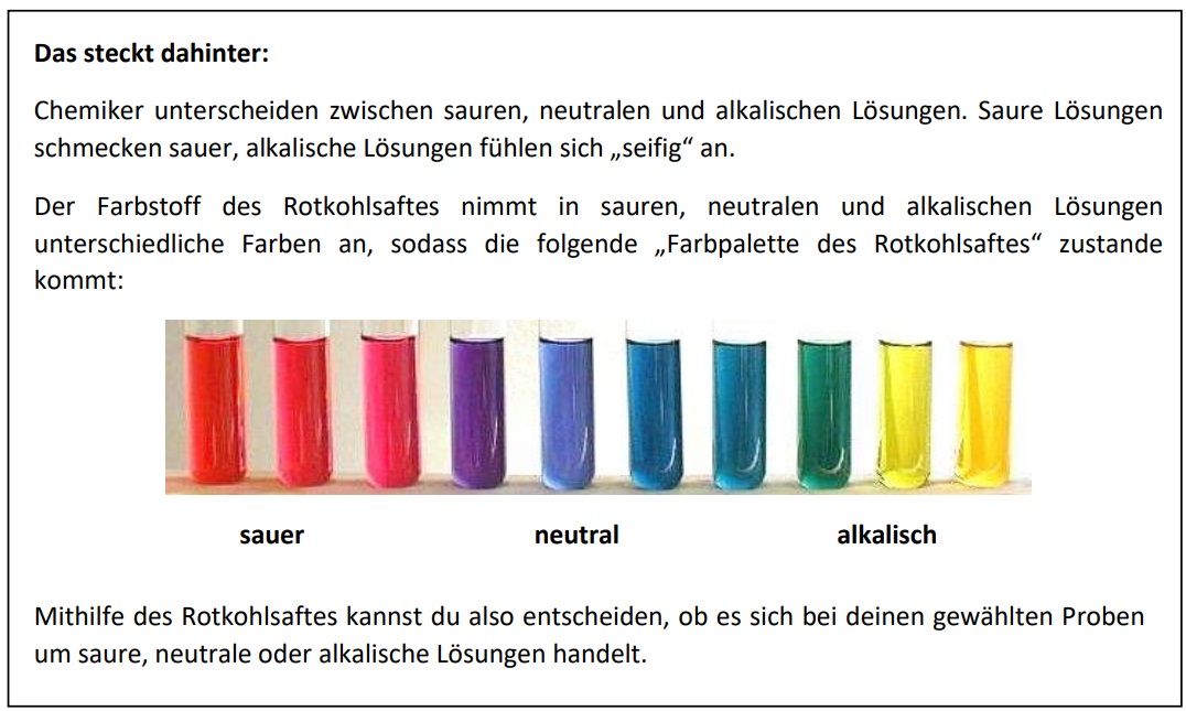 - Verschiedene Proben, wie zum Beispiel Zitronensaft, Essigessenz, Leitungswasser, Fensterputzmittel, Rohrreiniger, Waschmittellösung usw.