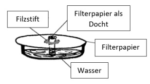 - Fülle die Glasschale mit Wasser und stelle den Docht hinein. (Achtung! Das erste Filterpapier darf nicht in das Wasser tauchen.)