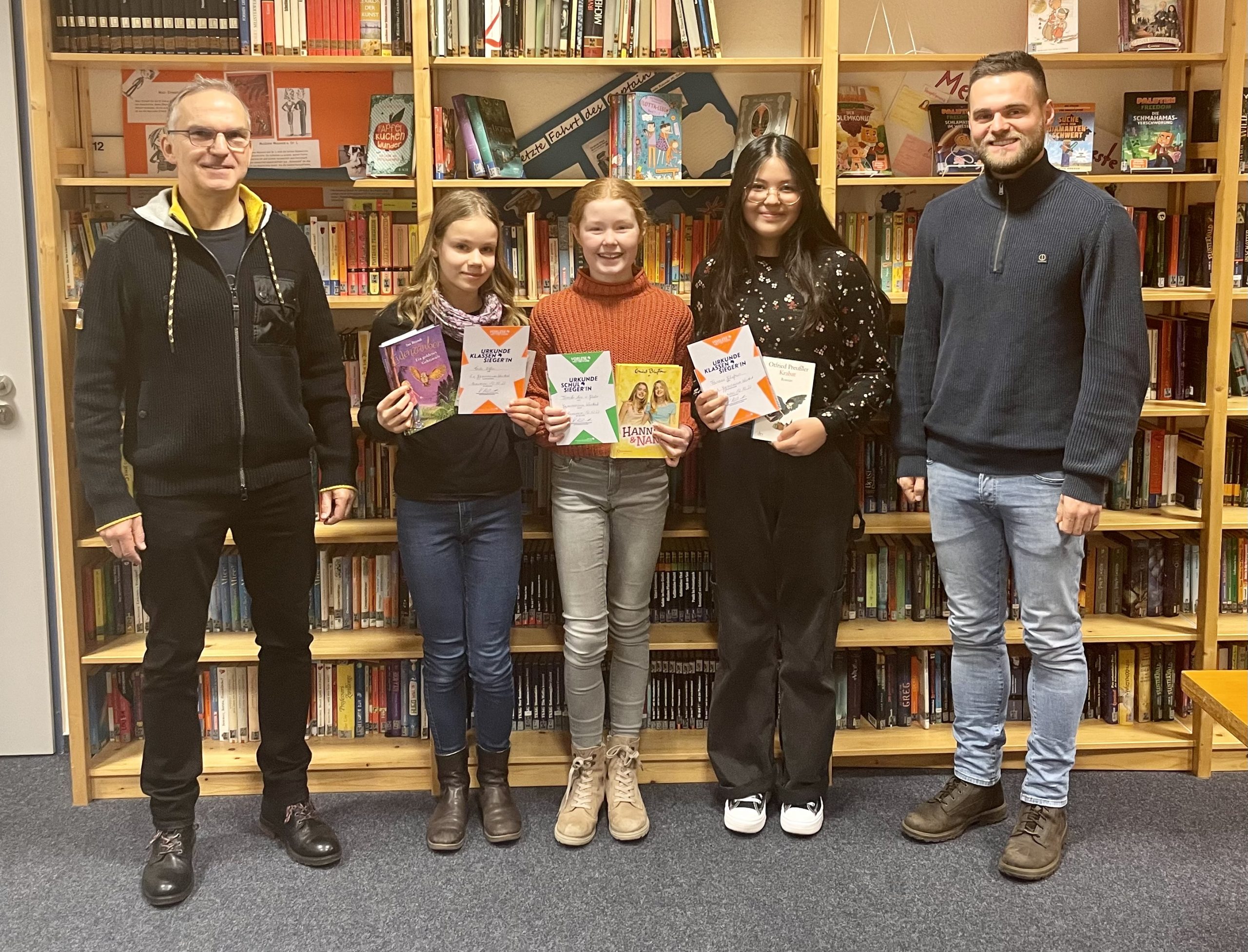 Die Entscheidung, wer nun Schulsiegerin wurde, traf eine dreiköpfige Jury, in diesem Jahr bestehend aus den drei Deutschlehrkräften der fünften Klassen: Frau Duensing, Herr Brandt (rechts) und Herr Kraatz-Peters (links). Am Montagmorgen, in der ersten Stunde, war es soweit: Die Klassensiegerinnen traten an, um die Jury mit ihren Fähigkeiten im Vorlesen zu überzeugen. Obwohl sich alle drei als gute Leserinnen präsentieren konnten, war sich die Jury einig, wer die Urkunde über den Schulsieg erhalten sollte, nämlich Tomke Ann von Glahn aus der 6a. Herzlichen Glückwunsch! Als Belohnung für ihr Engagement erhielten die Schülerinnen bei der Preisverleihung außer einer Urkunde auch einen Buchgutschein. Und mit einem gemeinsamen Foto, auf dem von der Jury die Fotografin, Frau Duensing, fehlt, endete die Veranstaltung.