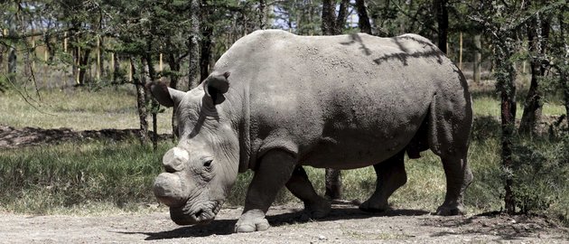 Sudan, 36, a male Northern White Rhinoceros that was shipped to Kenya from the Czech Republic grazes at the Ol Pejeta Conservancy near Nanyuki town, 350 km (217 miles) north of the capital Nairobi January 19, 2010. Four rare, northern white rhinos, half the known population left in the world, were transported to Kenya from the Dvur Kralove zoo in northern Czech Republic in a last-ditch bid to save the species from extinction. White rhinos are the largest land mammals after elephants and typically live in herds of up to 14 animals. The numbers of the northern subspecies have plummeted from an estimated 500 in the 1970s due mainly to poachers. REUTERS/Noor Khamis (KENYA – Tags: ANIMALS SOCIETY)